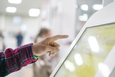 Saleswoman shows female and man couple interactive conent on digital tablet
